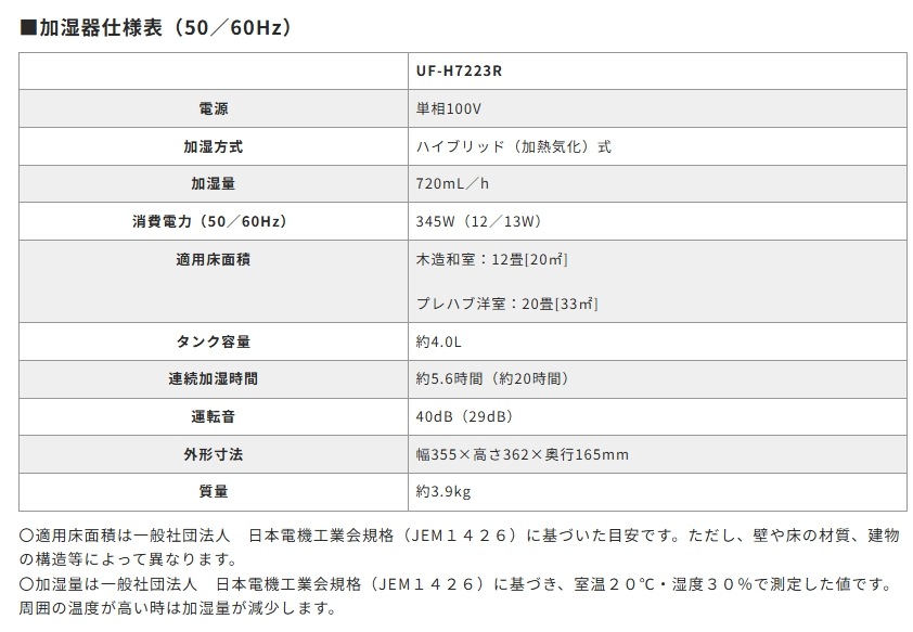 〇加湿量は一般社団法人 日本電機工業会規格(JEM1426)に基づき、室温20℃・湿度30%で測定した値です。周囲の温度が高い時は加湿量が減少します。
