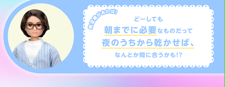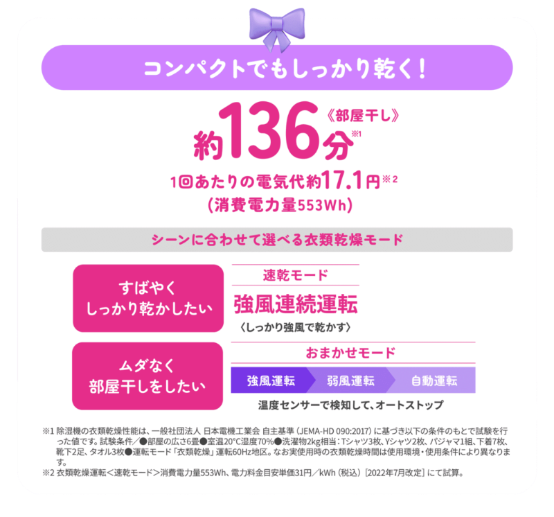 | 運転モード | 除湿(標準・自動)、衣類乾燥(速乾・おまかせ) | ||