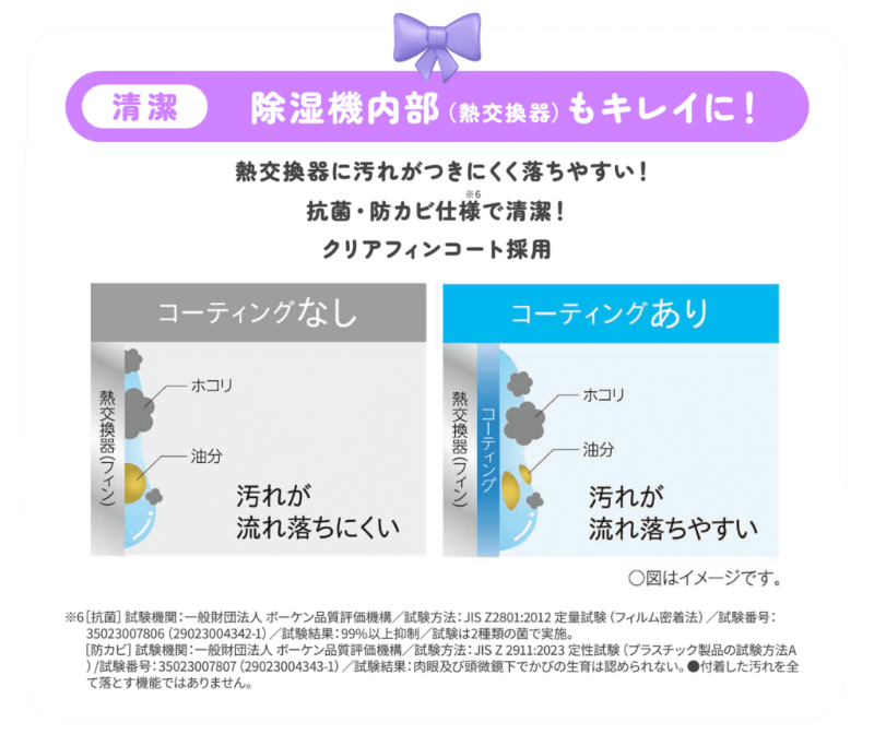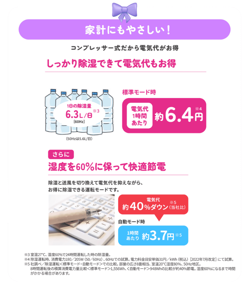 | 電気代のめやす※7(50/60Hz) | 除湿時:5.6/6.4円/h、衣類乾燥時:5.9/6.7円/h | ||